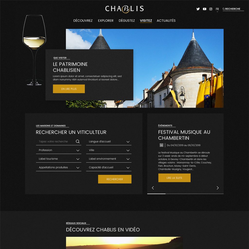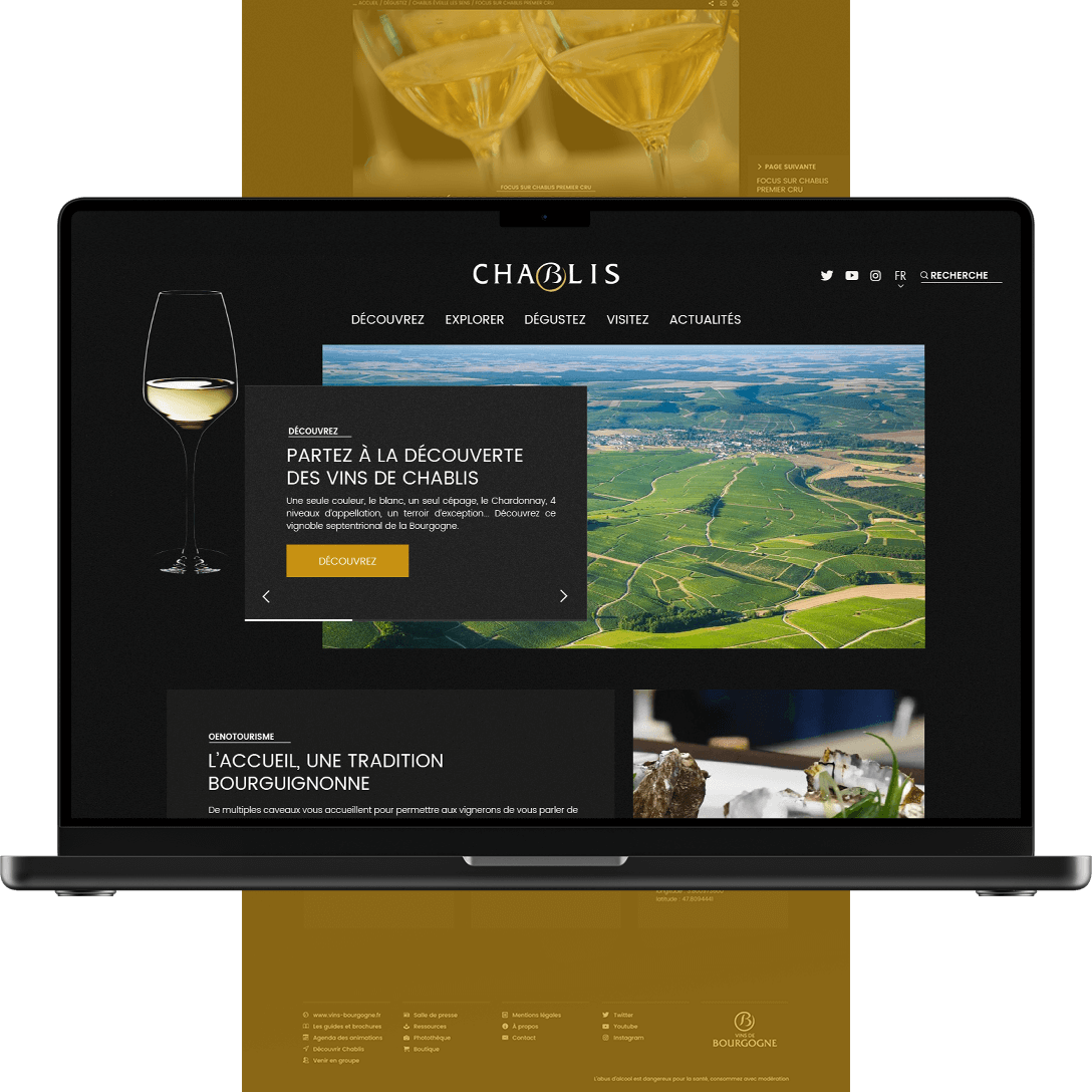 Véritable porte-parole des professionnels du vin en Bourgogne, le BIVB souhaite moderniser les codes visuels du site internet consacré aux vins de Chablis. Les maîtres mots ? Ergonomie et « Mobile First » ! L'objectif est d'inviter à l’œnotourisme dans la région du Chablisien, connue pour ses vins blancs.